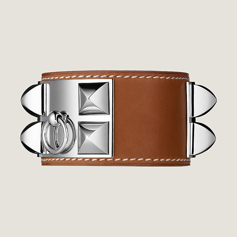 Bracelet en veau Barénia, doté de clous Médor et d'un anneau. Attache réglable à l’arrière, finition en palladié