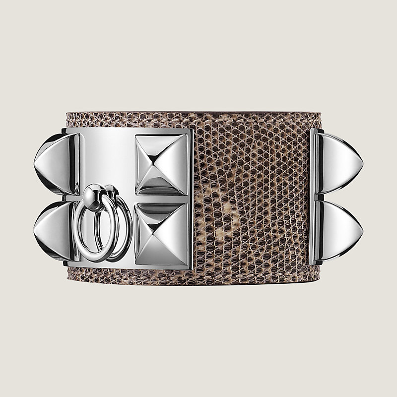 Bracelet en lézard Natura lisse, doté de clous Médor et d'un anneau. Attache réglable à l’arrière, finition en palladié