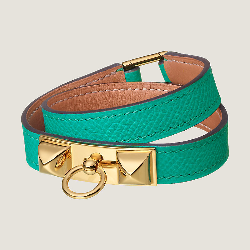 Bracelet double tour en veau Epsom, doté de clous Médor et d'un anneau, doublure en veau Zermatt, attache à l'arrière. Finition plaqué or
