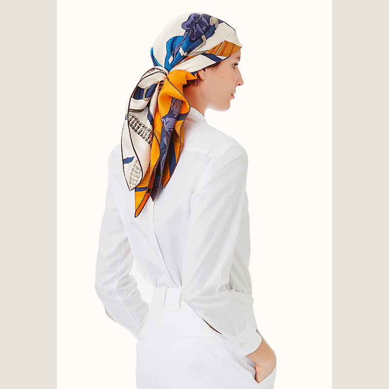 Accessoire intemporel du vestiaire Hermès, le carré 90 est un incontournable qui se porte aussi bien autour du cou, qu’en ceinture, en bandeau ou en turban.