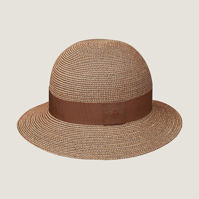 Chapeau pour femme en tresse de papier, bande de garniture en gros grain. Discrètement orné de la signature "H" diamant