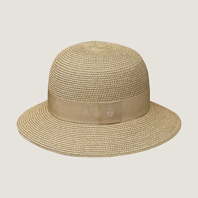 Chapeau pour femme en tresse de papier, bande de garniture en gros grain. Discrètement orné de la signature "H" diamant