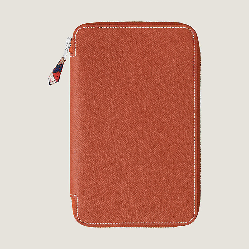 Couverture d'agenda en veau Epsom, doublée en soie imprimée « Carré Cube », une épingle et trois poches intérieures