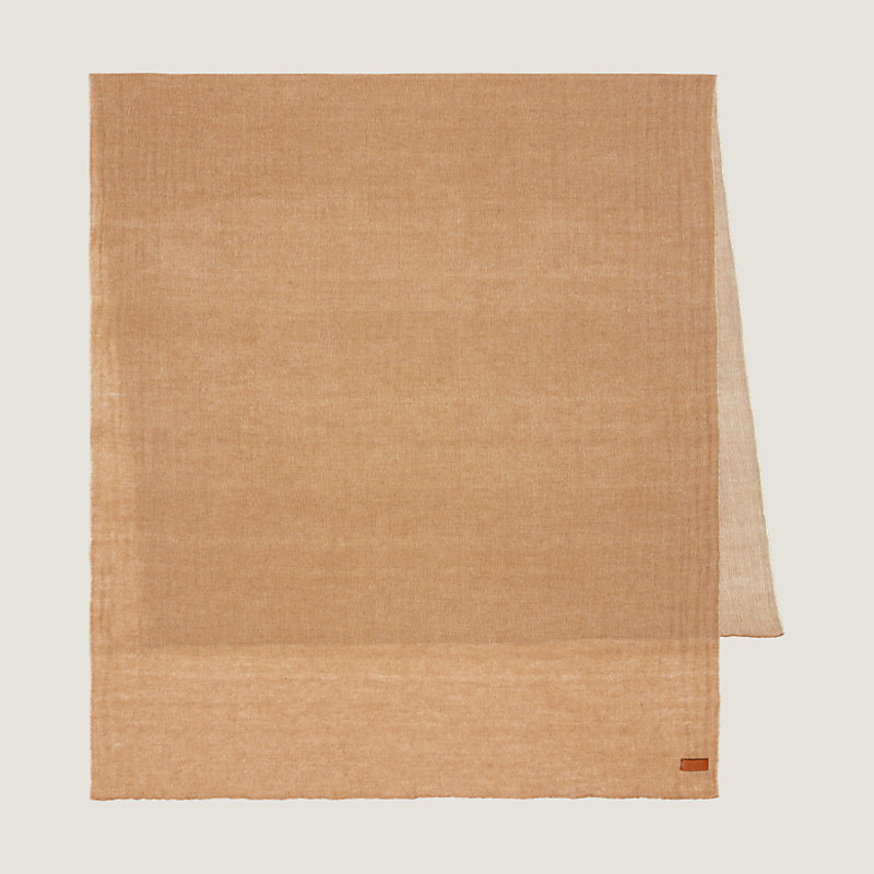 La laine de chameau est une fibre naturelle noble et résistante, ses fils d'une grande finesse se mêlent au fils de soie pour une étole légère aux tons naturels.