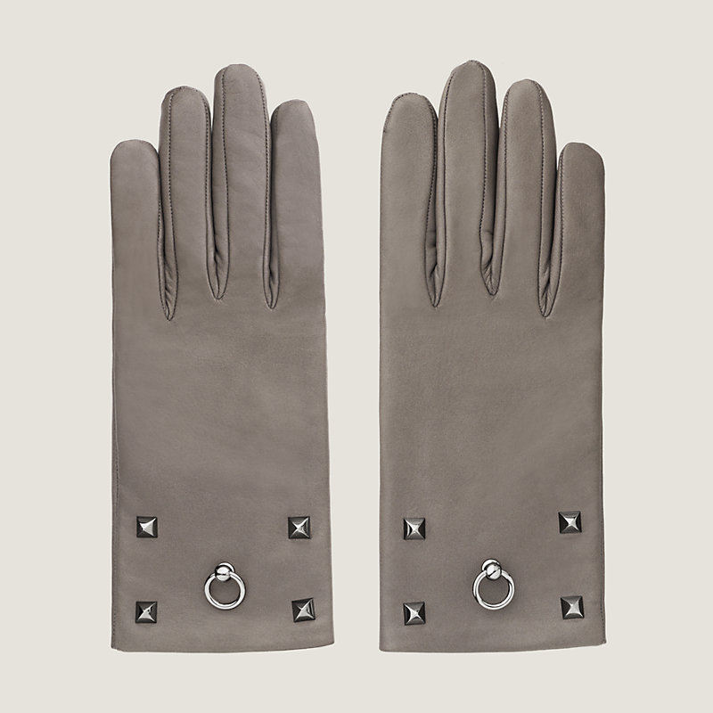 Gants pour femme en agneau glacé, doublure en soie, garnitures Collier de Chien en métal palladié