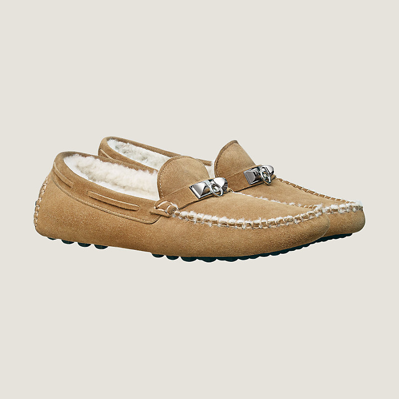 Mocassins de conduite ultra souples en veau velours, doublure en peau lainée, plateau cousu main, boucle « Minidog » palladiée, semelle picots Clous Pyramide en gomme