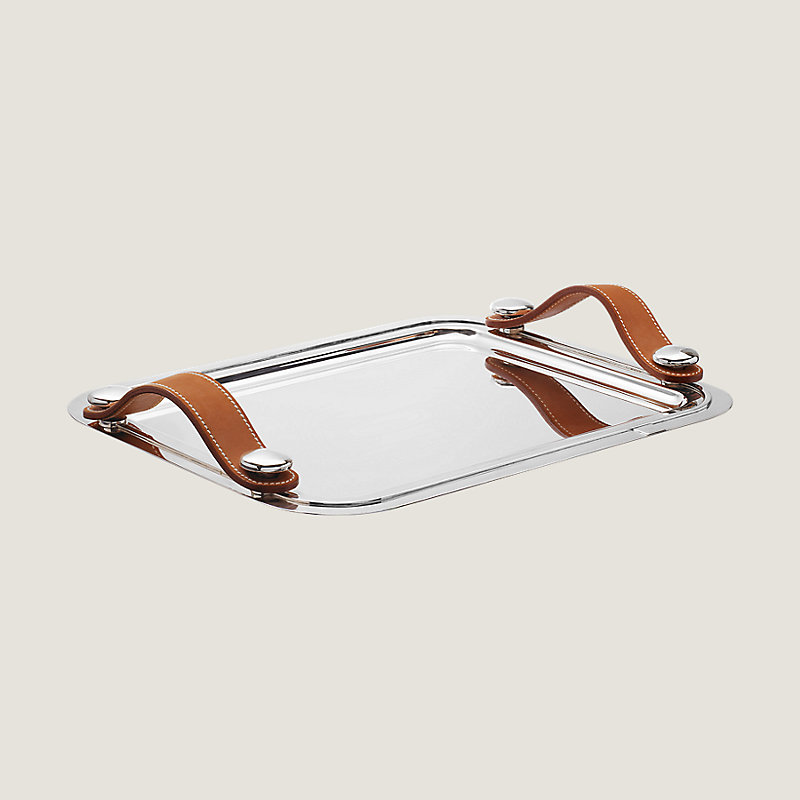 Plateau à courrier en métal argenté, poignées en vache à bride