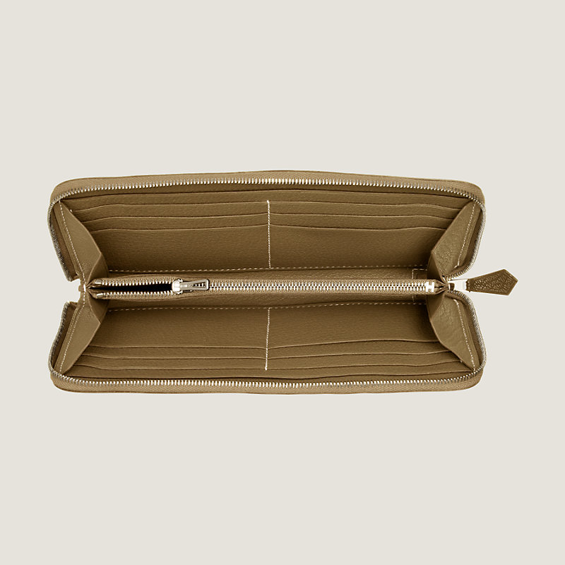 Portefeuille en chèvre Mysore, fermeture à glissière argentée palladiée. À l'intérieur : dix poches cartes, un porte-monnaie avec fermeture à glissière