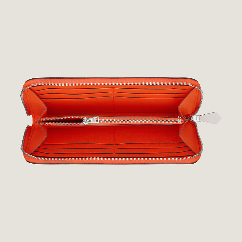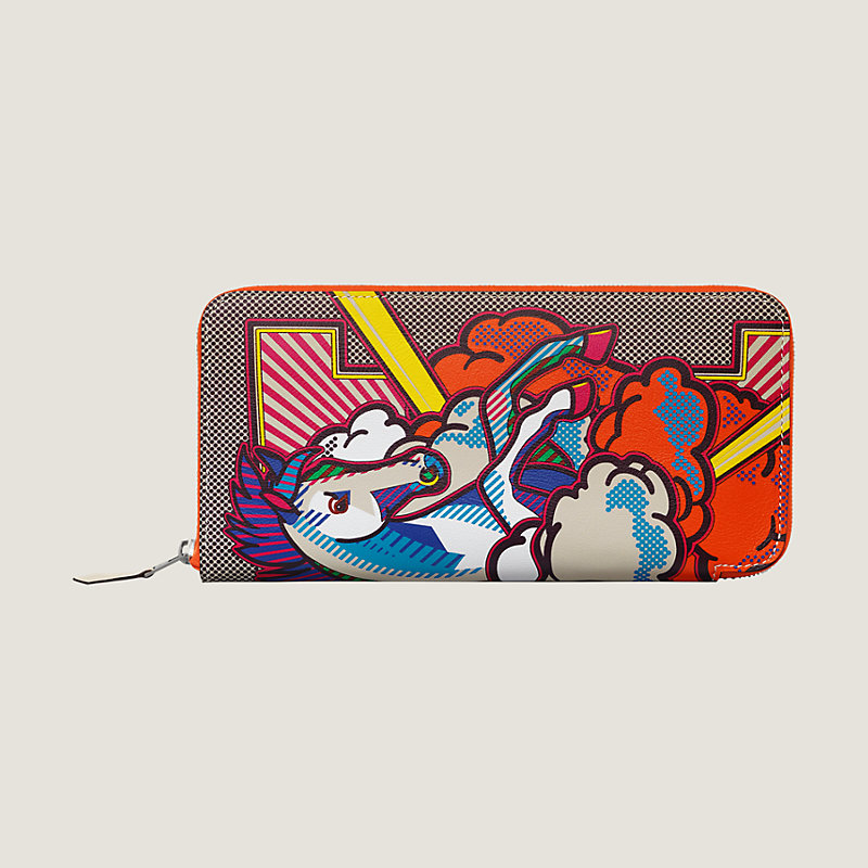 Portefeuille zippé en veau Swift imprimée « Pégase Pop », fermeture à glissière en métal argenté palladié. À l'intérieur : deux poches cartes de crédit, deux poches plates et un porte-monnaie avec fermeture à glissière