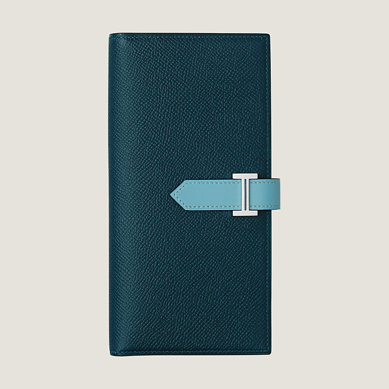 Portefeuille combiné à soufflet en veau Epsom, et veau Tadelakt, doublé en agneau. À l'intérieur : un porte-monnaie avec fermeture à glissière et fermoir H en métal argenté palladié, cinq poches cartes de crédit et quatre poches plates