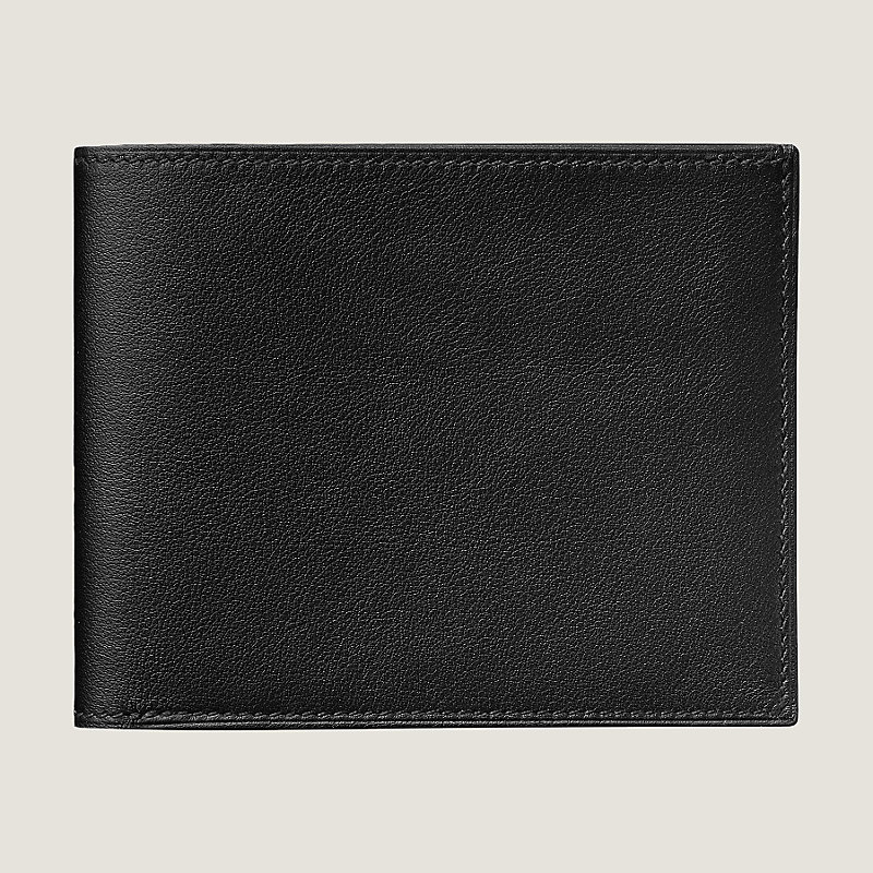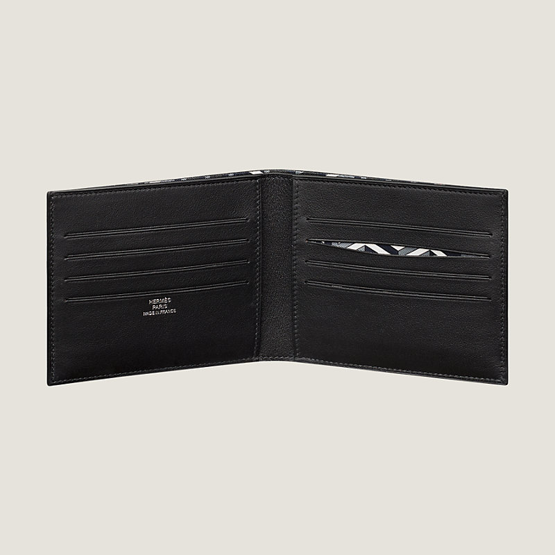 Portefeuille compact en veau Swift, doublé en soie imprimée "Carré Cube". À l'intérieur : deux poches plates, une poche financière, huit poches cartes de crédit