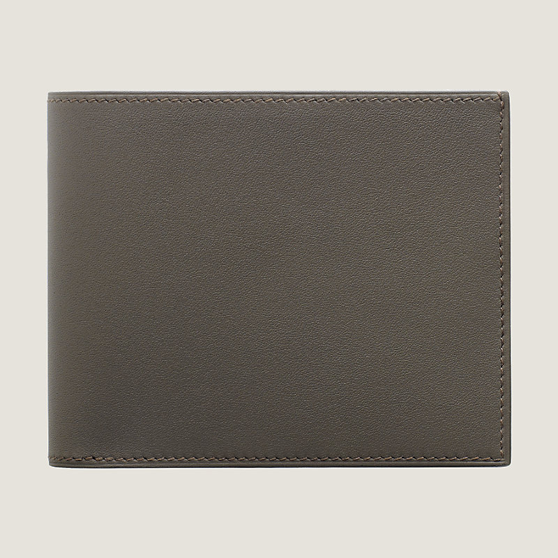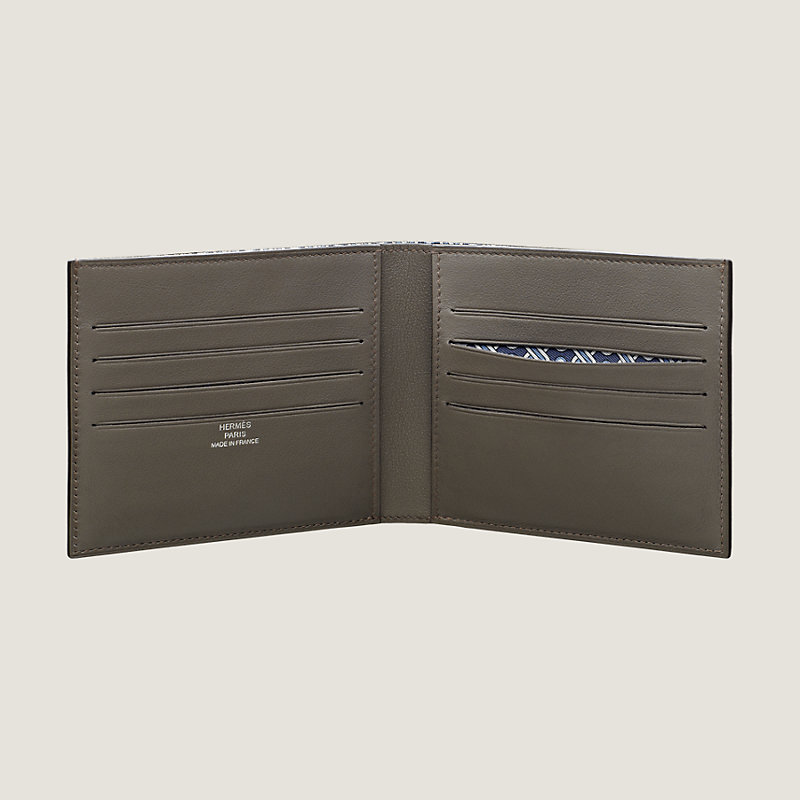 Portefeuille compact en veau Swift, doublé en soie imprimée « Luco ». À l'intérieur : deux poches plates, une poche financière, huit poches cartes de crédit