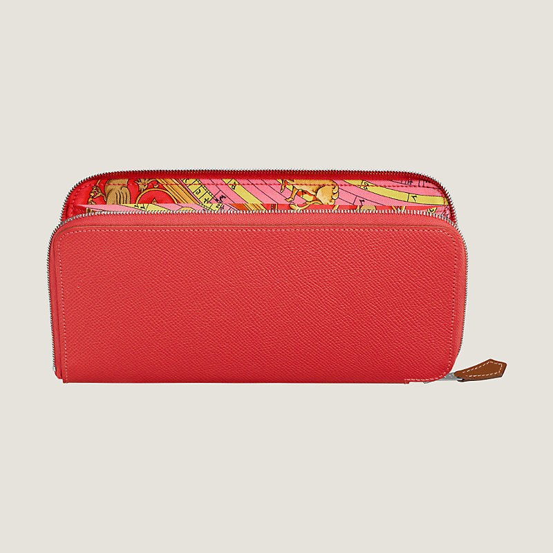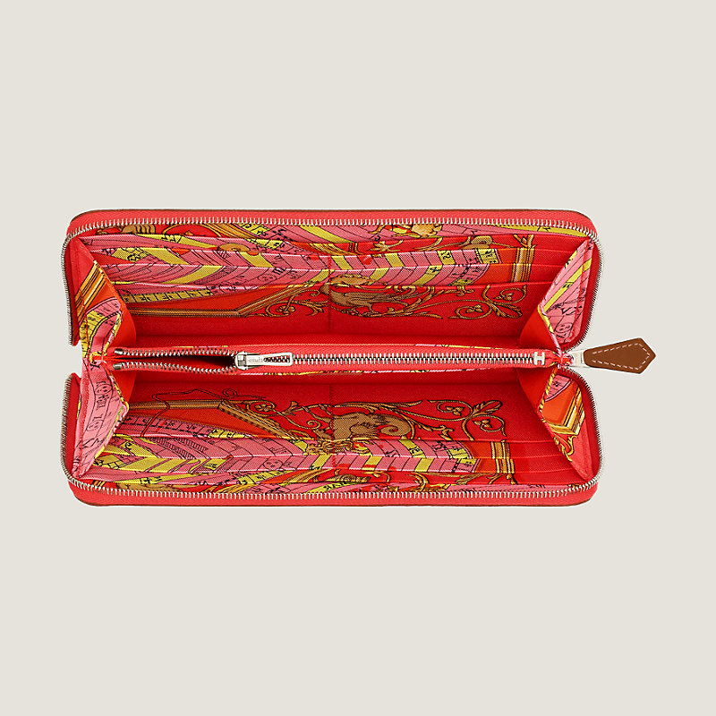 Portefeuille combiné en veau Epsom, doublé en soie imprimée « Astrologie », fermeture à glissière en métal argenté palladié. À l'intérieur : une poche monnaie zippée, quatre poches plates et douze poches cartes de crédit
