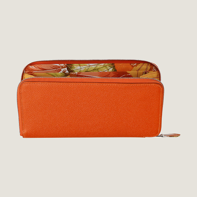 Portefeuille long zippé en veau Epsom, doublé en soie imprimée « Brazil », fermeture à glissière en métal argenté palladié. À l'intérieur : un porte-monnaie zippé, quatre poches plates et douze poches cartes de crédit