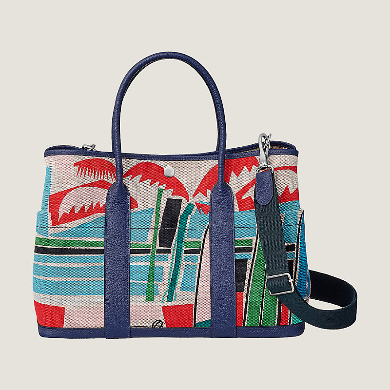 Sac en vache Country, doublure en toile H imprimée « Sea, Surf & Fun », bijouterie argent palladié, poche intérieure avec fermeture à glissière