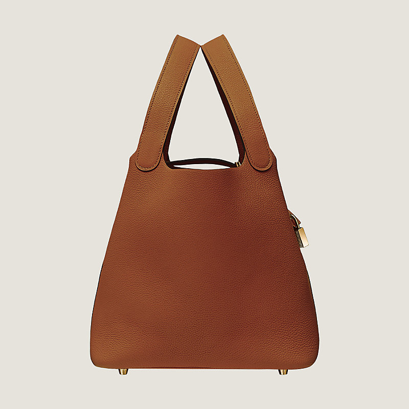 Sac en taurillon Maurice, fermé par un lien de cuir tenu par un cadenas, bijouterie plaquée or