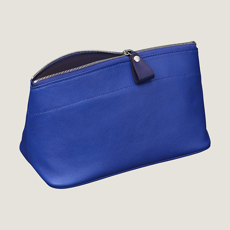 Trousse en agneau Milo et veau Swift, doublure contrastée en veau Swift et toile chevron, fermeture à glissière argentée palladiée