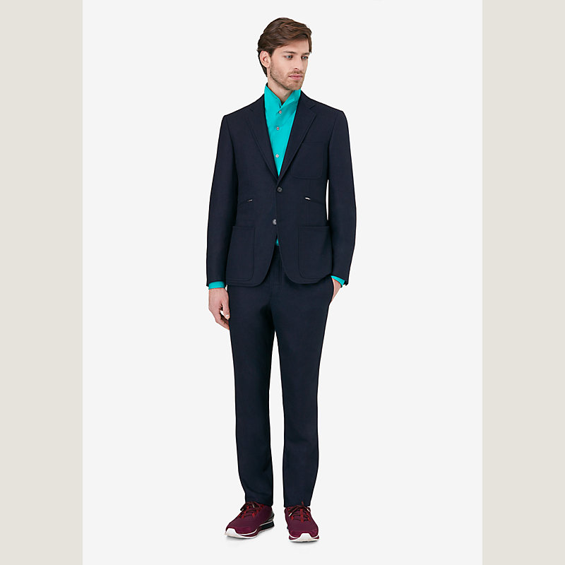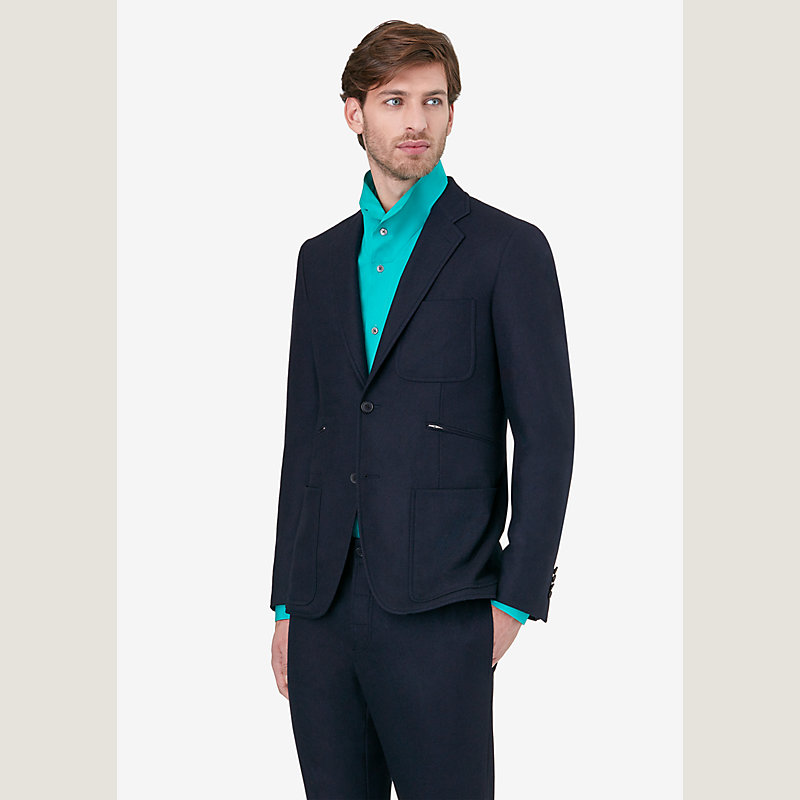 Veste 24 Relax droite en flanelle de laine, corps non-doublé, manches doublées en satin, col cranté, deux poches appliquées, deux poches passepoilées zippées, une fente dos, demi doublée (100 % laine vierge)