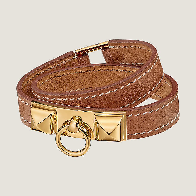 Zweifach-Wickelarmband aus Swift-Kalbsleder mit Clous Médor und Ring, Befestigung an der Rückseite. Vergoldung