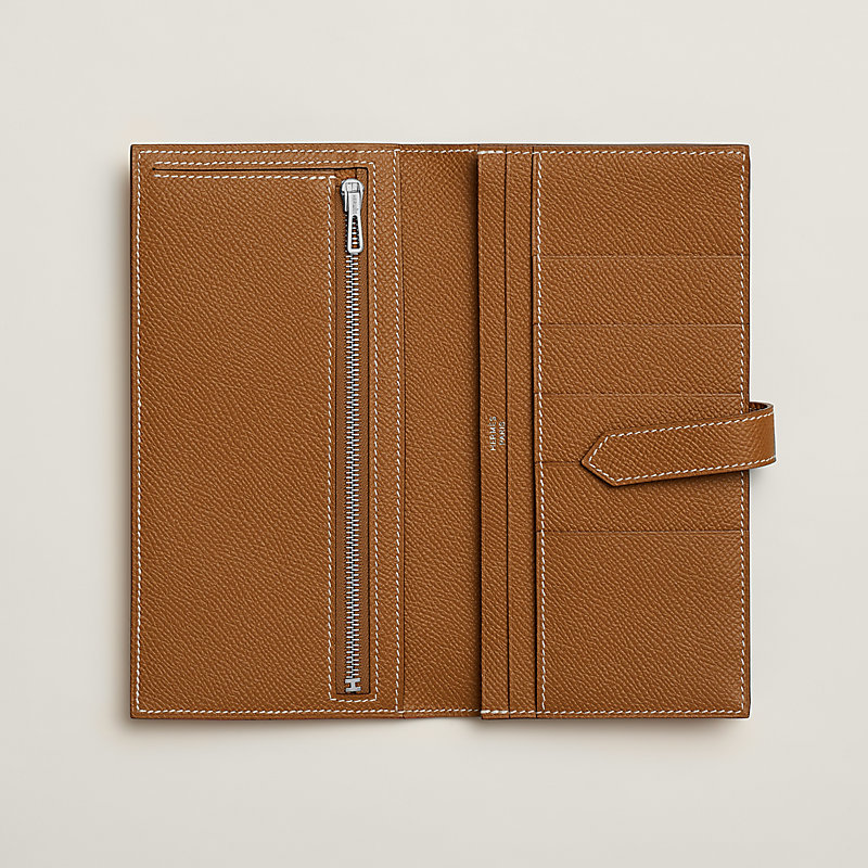 Brieftasche aus Epsom-Kalbsleder mit Einschubfach, Verschluss durch Lederriemen und "H"-Schließe mit Silber- und Palladiumauflage