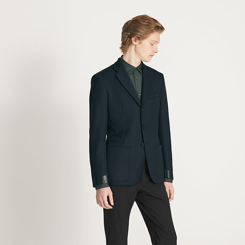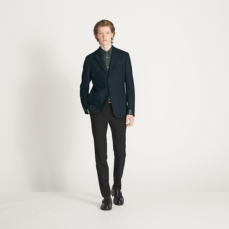 Gerade geschnittene Jacke 24 Relax aus technischer Wolle, Rumpf ungefüttert, Ärmel mit Satininnenfutter, Reverskragen, Drei-Knopfverschluss, 2 aufgesetzte Taschen, auf der Rückseite geschlitzt, Lammlederdetail mit Anti-Soiling-Beschichtung (100 % Schurwolle).