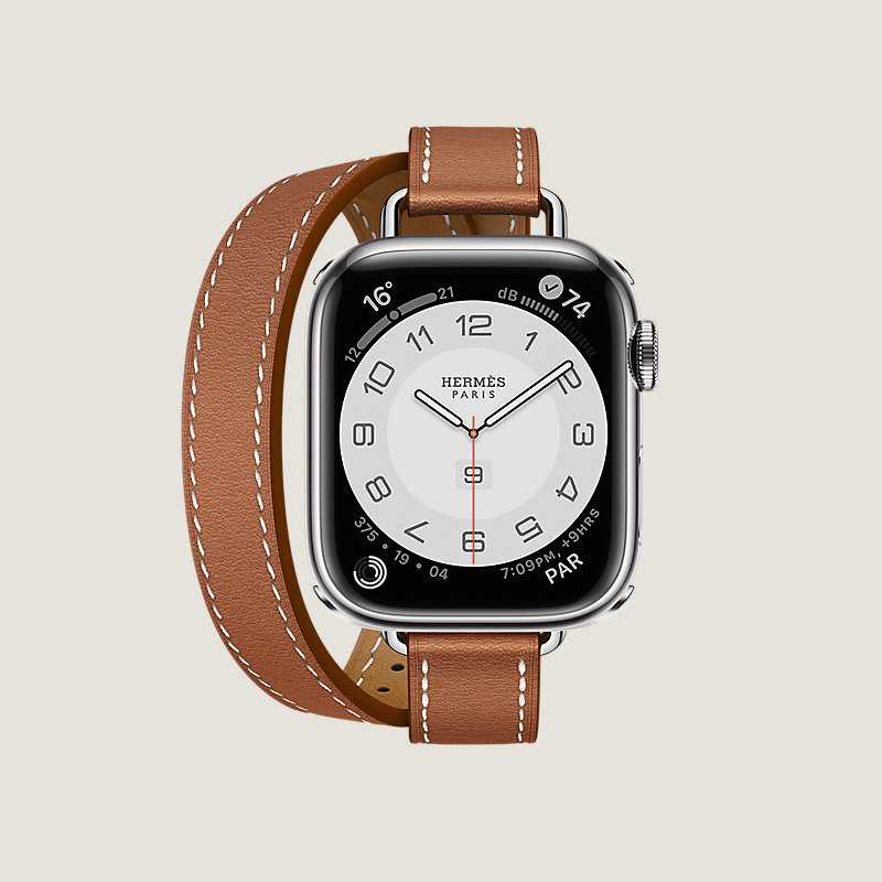 Boîtier Apple Watch Hermès Series 8 en acier inoxydable 41 mm & Bracelet double tour en veau Swift coloris Gold