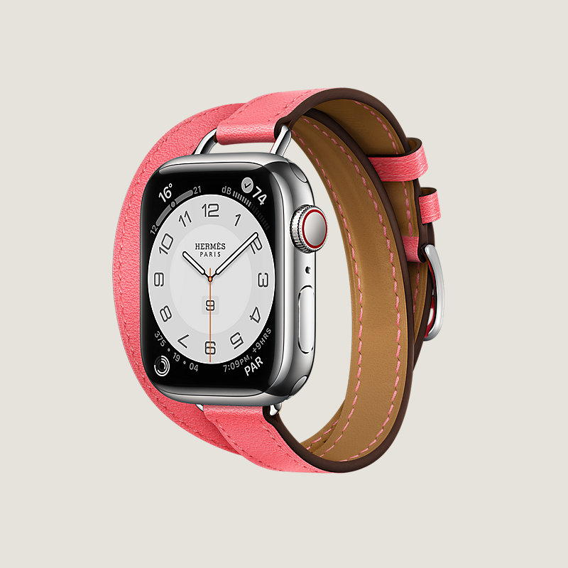 Boîtier Apple Watch Hermès Series 8 en acier inoxydable 41 mm & Bracelet double tour en veau Swift coloris Rose Azalée
