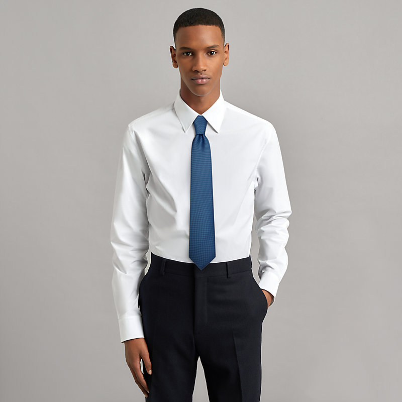 Par un jeu de lumière, le tissage Jacquard se révèle sur cette cravate unie. Un basique Hermès !