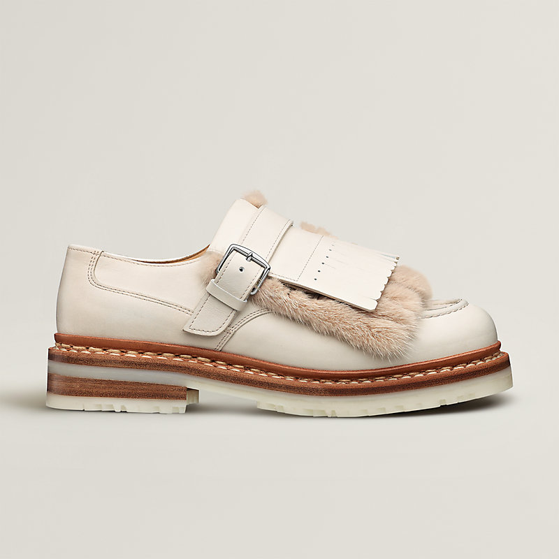 Derbies en veau gras, patte amovible en veau et vison rasé, semelle épaisse en cuir et gomme