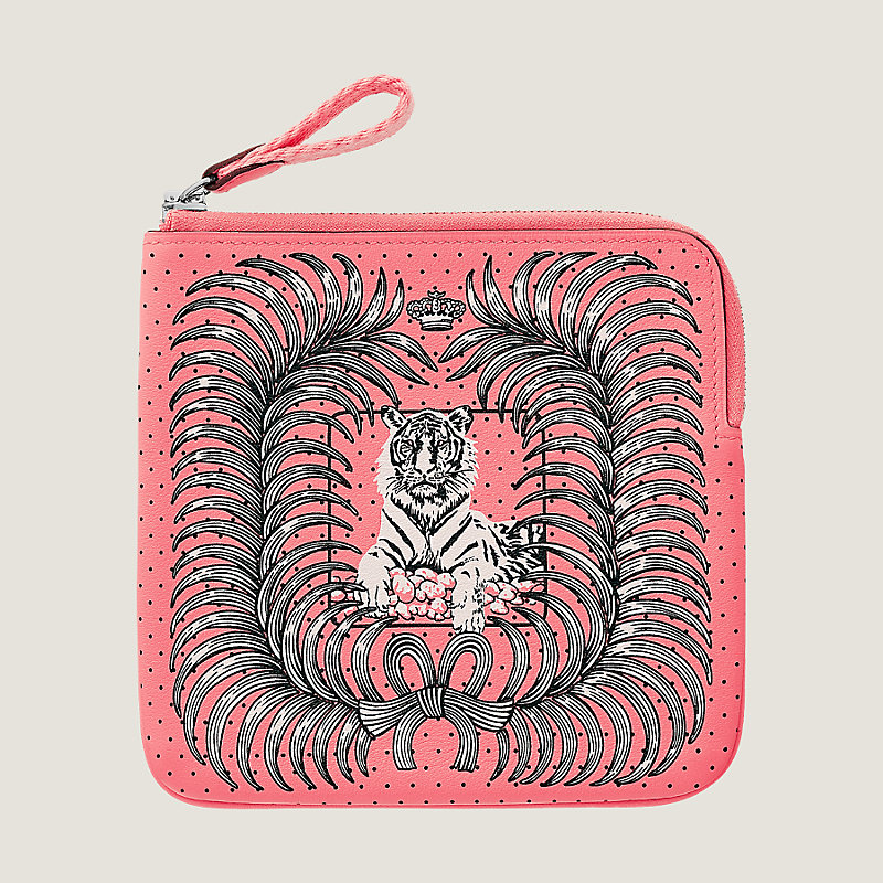 Trousse en veau Swift imprimé « Tigre Royal Bandana », tirette sangle en galon uni, fermeture à glissière argentée palladiée