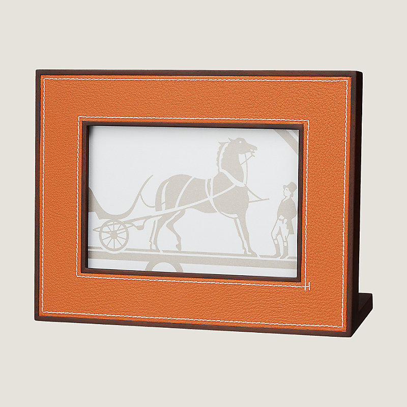 Horizontal leather picture frame in goatskin with brown solid mahogany wood