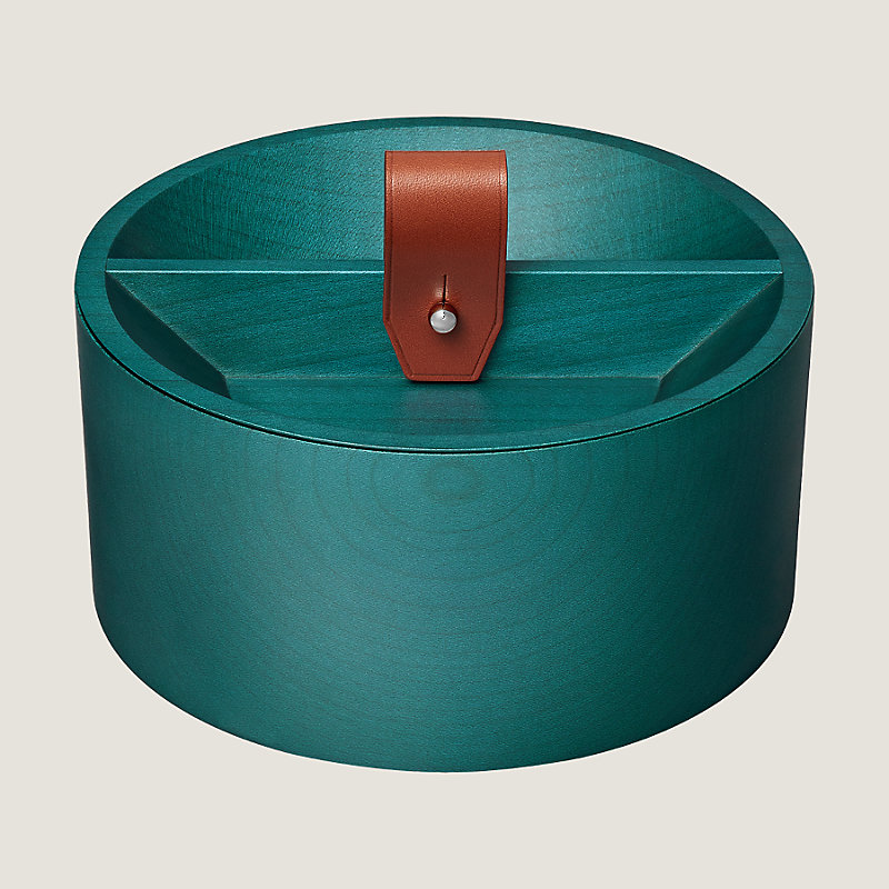 Round box in solid tinted maple wood and bridle leather