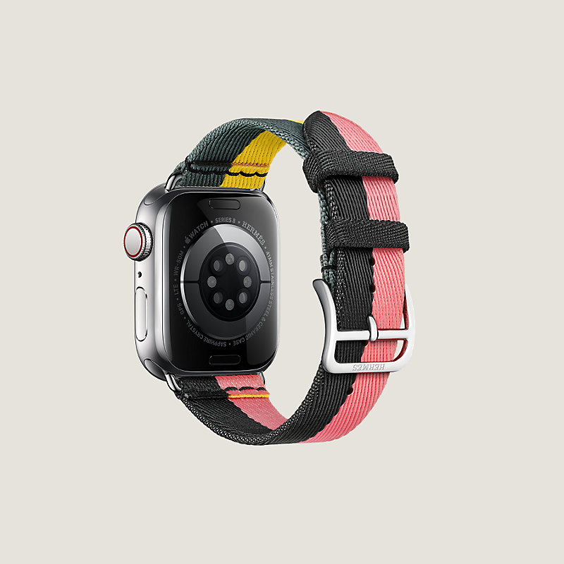 Esta correa, inspirada en las casacas de los jinetes, aporta un estilo colorido y deportivo a su Apple Watch Hermès.