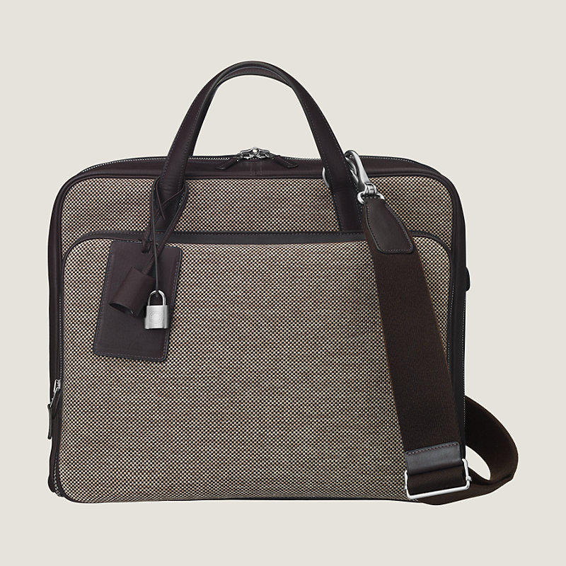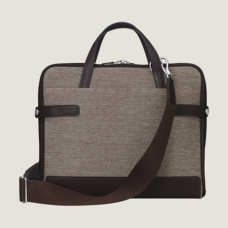 Porte-document 12h en toile H Tech membranée déperlante et cuir Taurillon Clémence, garnitures en métal argenté palladié brossé. Deux compartiments zippés : à l'avant, une poche plaquée en cuir Taurillon Clémence et un compartiment principal doublé en tissage chevron, munis d'une poche moussée pouvant accueillir un ordinateur jusqu'à 13 pouces. Poche extérieure plaquée à l'arrière et système de pattes en cuir pour attacher le porte-document