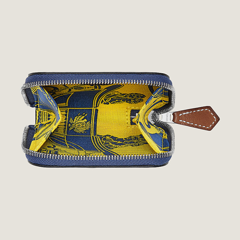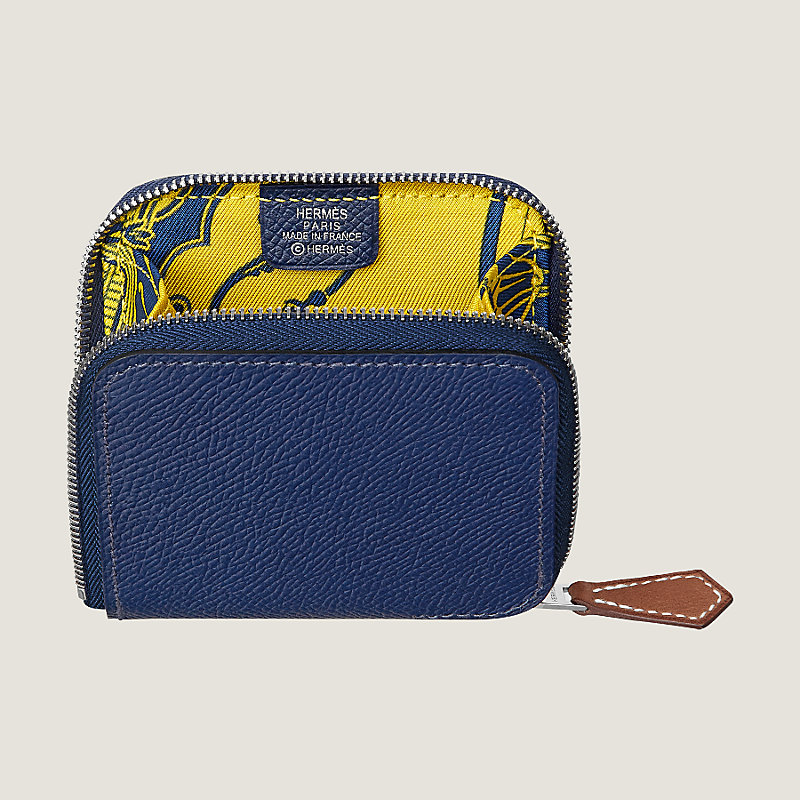 Porte-monnaie en veau Epsom et veau Barénia, doublé en soie imprimée « Ex Libris », fermeture à glissière en métal argenté palladié