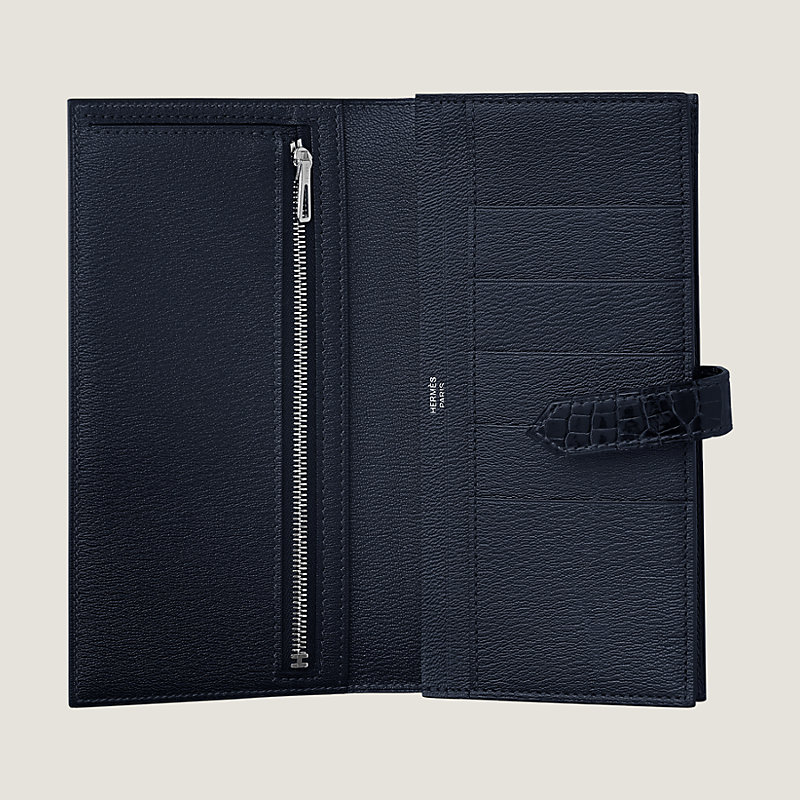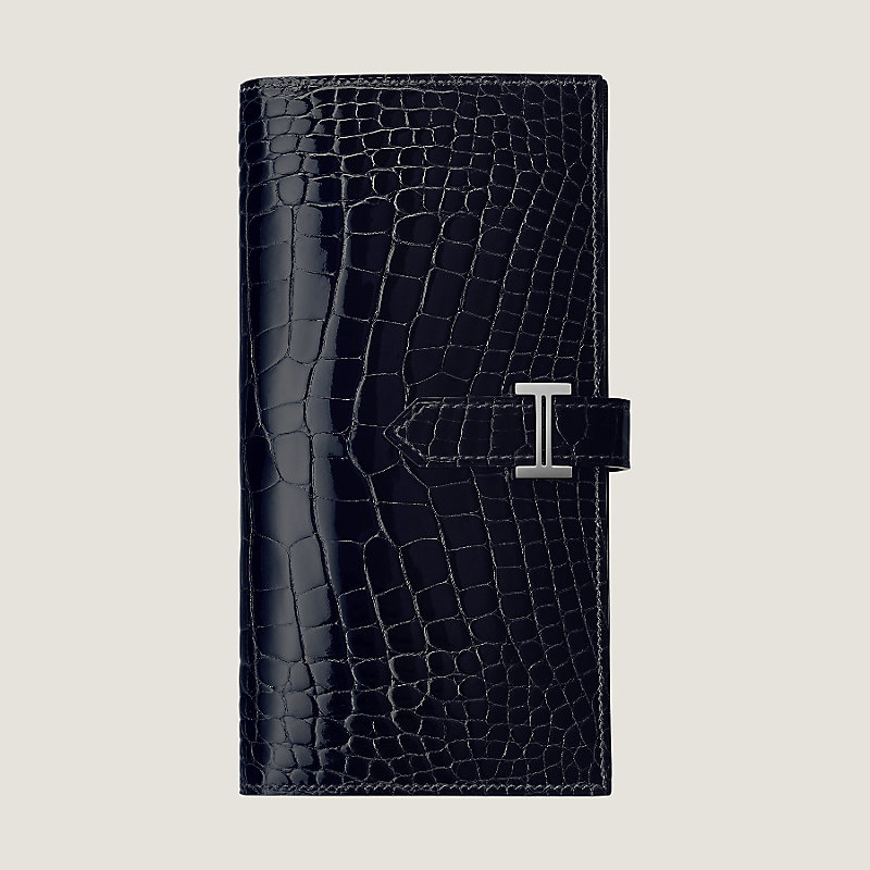 Portefeuille à soufflet en alligator Mississippiensis lissé, fermé par une patte en cuir et un fermoir « H » argenté palladié