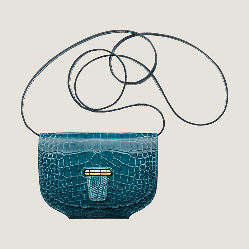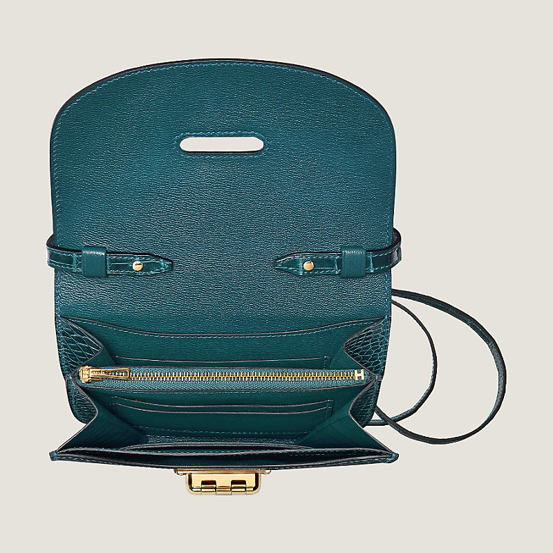 Portefeuille à bandoulière amovible en alligator lisse, et lézard Niloticus lisse. À l'intérieur : une poche et un porte-monnaie avec fermeture à glissière. Fermoir en permabrass. Compagnon de shopping pour une journée, à glisser dans son cabas ou à porter en bandoulière pour avoir les mains libres