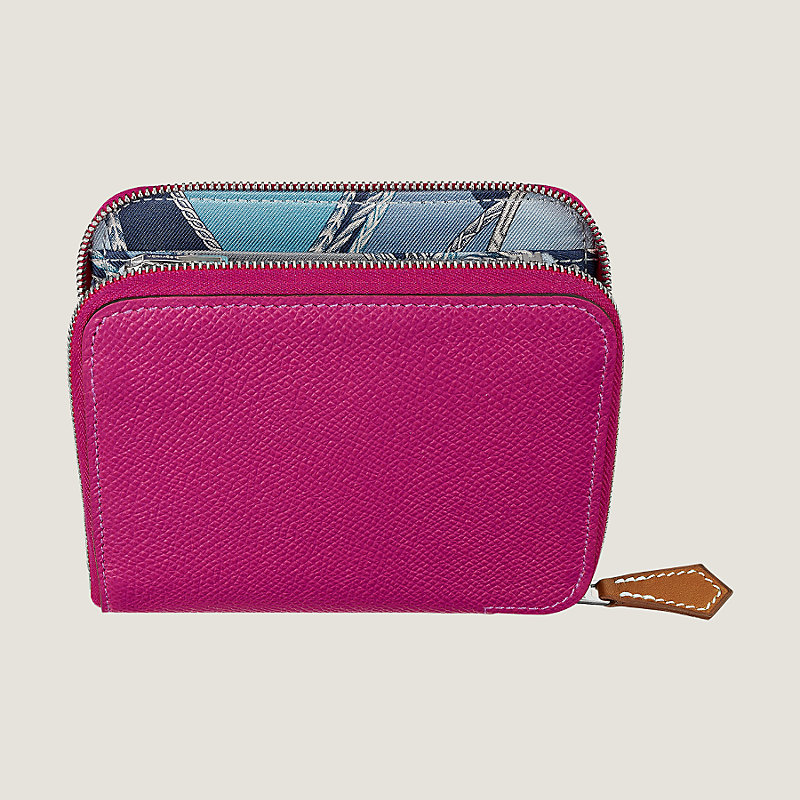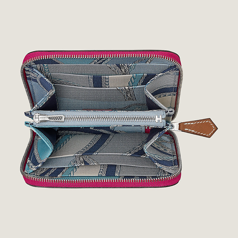 Portefeuille compact en veau Epsom et veau Barénia, doublé en twill de soie imprimé « Robe du soir »