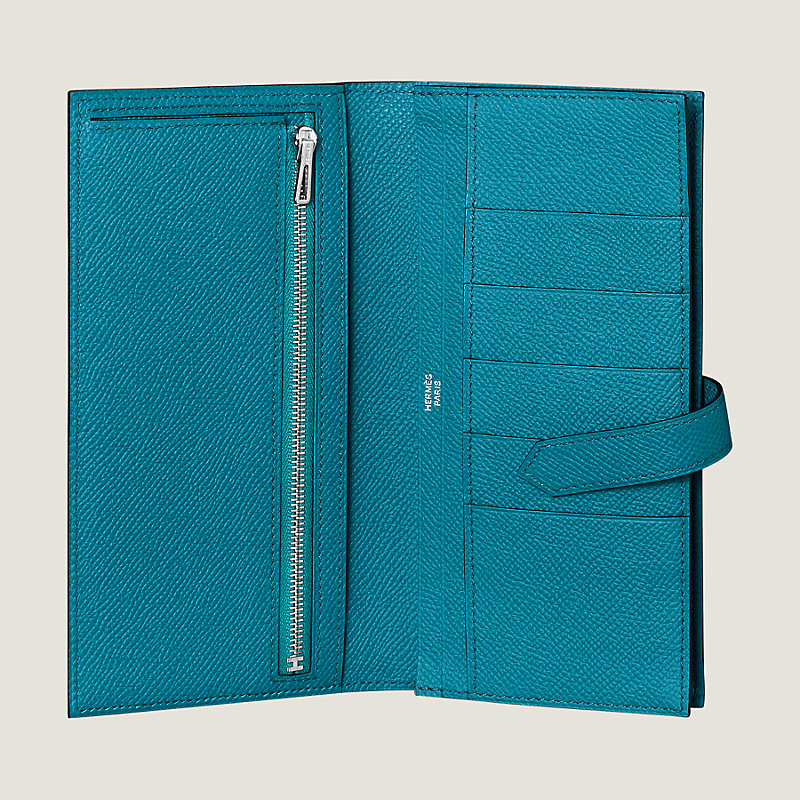 Wallet with gusset in Epsom calfskin with 5 credit card slots, 2 pockets, zipped change purse and palladium plated 'H' tab closure