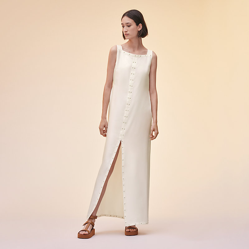 컬럼 드레스의 실크 트윌 소재가 물결치듯 우아하게 흘러내리며 몸을 감싸주어, 미니멀하면서도 슬림한 실루엣을 완성합니다. 화이트 드레스가 선보이는 궁극의 심플함은 앞면의 긴 슬릿과 뒷면의 마팅게일과 같은 대담한 디테일과 대조를 이룹니다. 가죽 장인의 탁월한 전문성을 드러내는 스터드 트리밍이 실루엣의 유려한 곡선을 강조합니다.