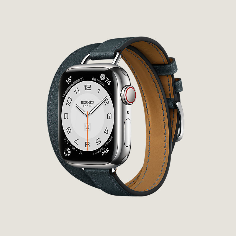 Boîtier Apple Watch Hermès Series 8 en acier inoxydable 41 mm & Bracelet double tour en veau Swift coloris Vert Rousseau