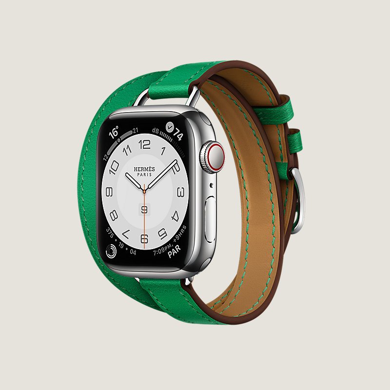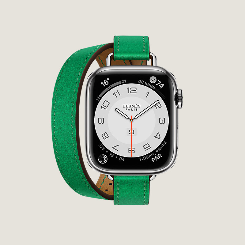 Boîtier Apple Watch Hermès Series 8 en acier inoxydable 41 mm & Bracelet double tour en veau Swift coloris Vert Bambou