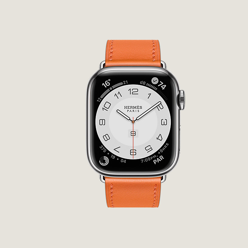 Boîtier Apple Watch Hermès Series 8 en acier inoxydable 41 mm & Bracelet simple tour en veau Swift coloris Orange