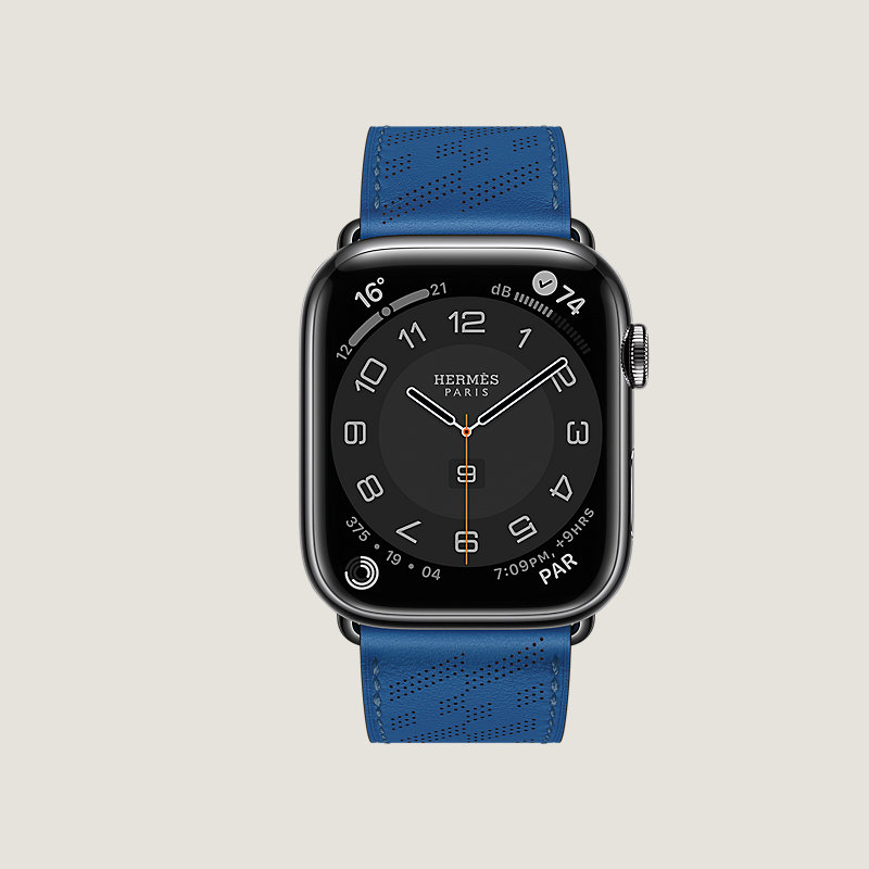 Boîtier Apple Watch Hermès Series 8 en acier inoxydable Noir Sidéral 45 mm & Bracelet simple tour en veau Swift coloris Bleu de France