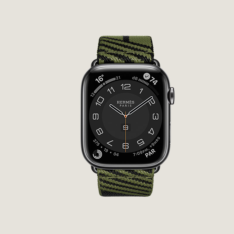 Boîtier Apple Watch Hermès Series 8 en acier inoxydable Noir Sidéral 45 mm & Bracelet simple tour en nylon tissé coloris Vert Véronèse/Noir, motif « H Vibration »