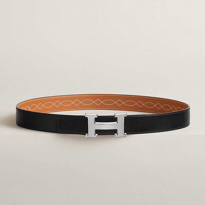 & Cuir de ceinture réversible en veau Chamonix 135 et veau Box 135. La broderie donne une allure casual chic à ce cuir, qu'il soit porté avec la boucle Far West ou tout autre modèle. Fabriqué en France
