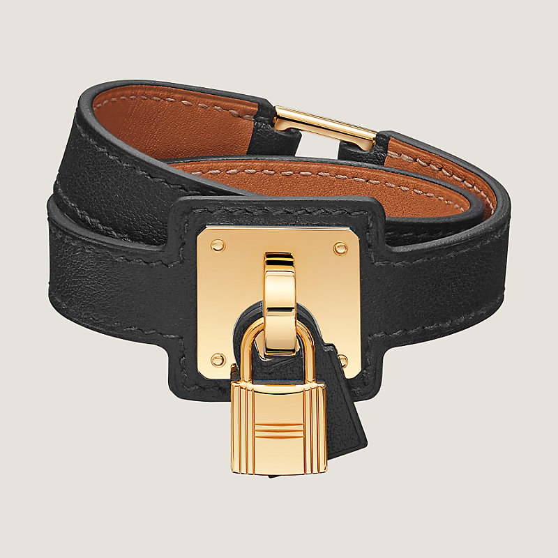 Ce bracelet double tour met à l’honneur le cadenas du sac éponyme. Il est ici affiné et associé à un cadenas en cuir stylisé qui le suit comme son ombre.