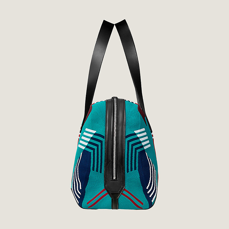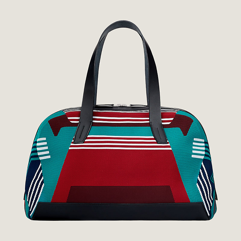 Sac de sport en maille technique et vache Hunter, bijouterie argentée palladiée, poche intérieure en veau Doublure, poignées en vache Hunter