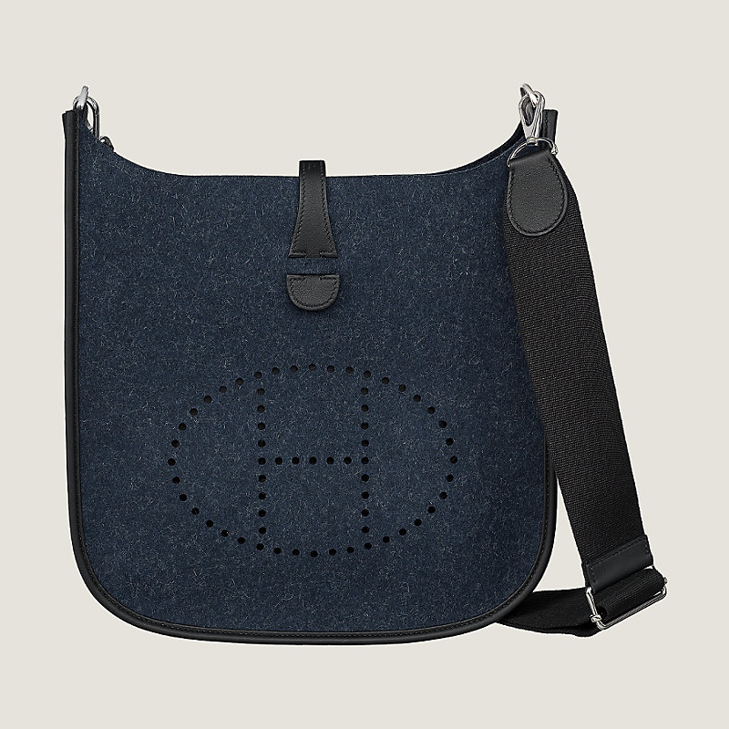 Sac en feutre et veau Swift, fermé par une patte en cuir et un bouton-pression, bijouterie argentée palladiée, poche plate arrière extérieure, bandoulière amovible et ajustable en sangle polycoton unie