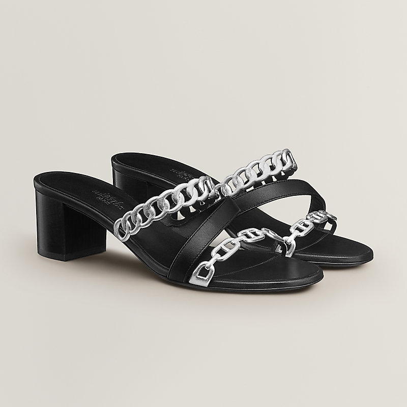 Alternance de brides et chaînes bicolores sur ces sandales en nappa et nappa métallisé